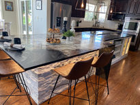 We expanded the island to accommodate more seating, added an under-counter beverage fridge, installed pull out trash and recycling storage.