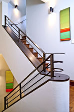 Custom-built mirrors (floating in raw-steel frames) to fill two walls